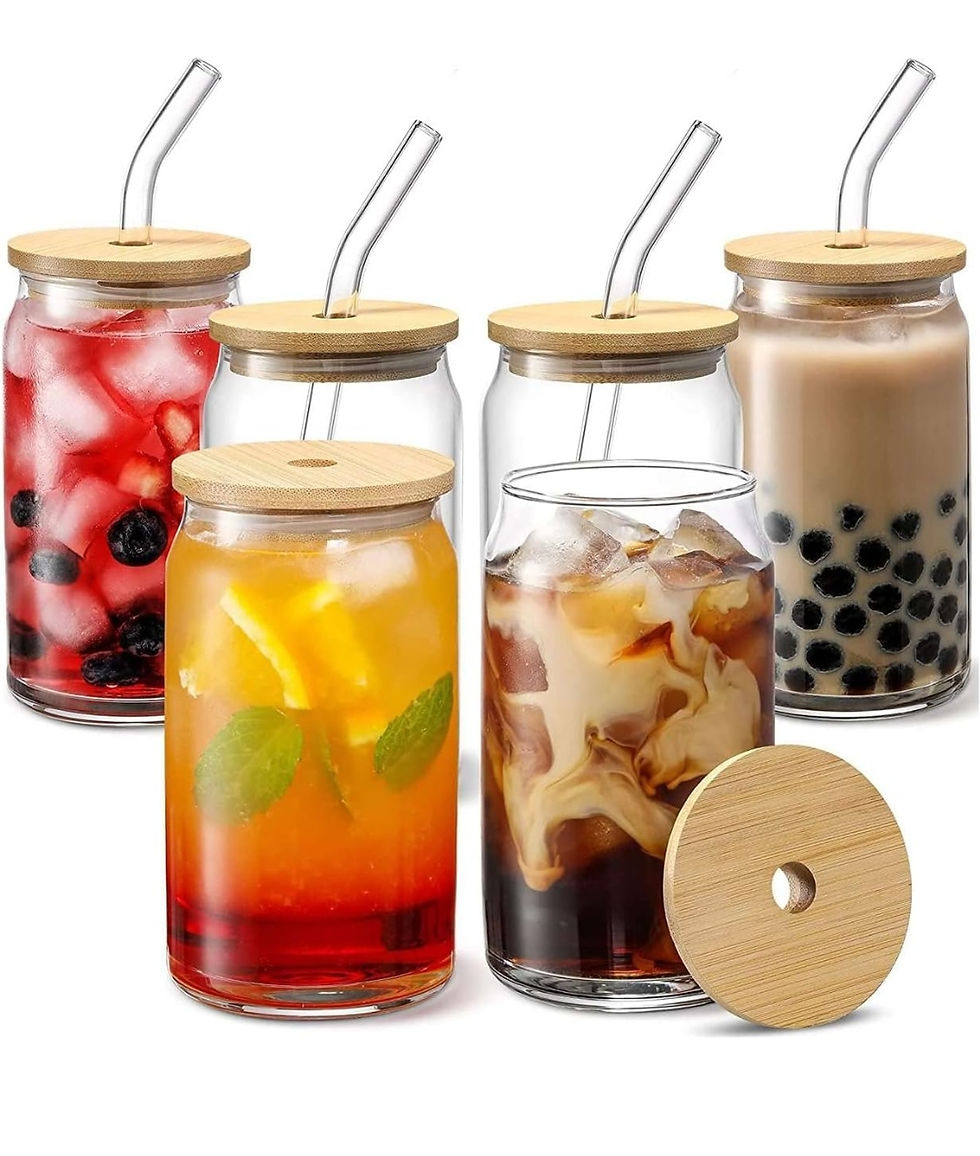 Beer Can Glass with Glass Straw and Bamboo Lid